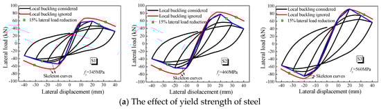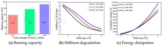 As illustrated in Figure 13a and Figure 14, the bearing capacity, lateral stiffness and cumulative dissipated energy of UHPCFST columns are both increased with the increase in the yield strength of steel. As expected, the bearing capacity and the post-peak ductility could be overestimated, neglecting the local buckling of the steel tube. The bearing capacities of UHPCFST columns are overestimated by 13.7%, 7% and 2.1% if the yield strength of steel is 345 MPa, 460 MPa and 560 MPa, respectively. The errors caused by local buckling are gradually decreased. This is mainly on the account that the steel with higher yield strength possess higher critical local buckling stress. However, the accuracy of post-peak ductility estimation is still not improved.