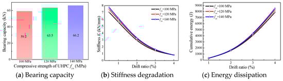 In Figure 13b and Figure 15, the bearing capacity, the lateral stiffness and the cumulative dissipated energy capacity of UHPCFST columns are only slightly increased with the compressive strength of UHPC increasing from 100 MPa to 140 MPa, which indicates that it is inappropriate to promote the seismic performance of UHPCFST columns by increasing the compressive strength of UHPC. Moreover, the error caused by the local buckling does not seem to be increased with the increase in compressive strength.