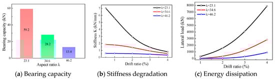 From Figure 13c and Figure 16, it can be seen that the length–diameter ratio has a significant influence on the seismic performance of UHPCFST columns. The bearing capacity, lateral stiffness and cumulative dissipated energy of the UHPCFST columns have significant negative correlations with the length–diameter ratio. Specimen S1, with a length–diameter ratio of 23.1, possesses plumper hysteretic curves, larger bearing capacity, as well as cumulative dissipated energy; whilst for specimens S6 and S7 with larger length–diameter ratios, although the residual deformation is small, the pinching effects of hysteresis curves are pretty serious and the energy dissipation capacity is worse. In addition, as the length–diameter ratio increases, not considering the local buckling of the steel tube will further increase the overestimation of the bearing capacity and post-peak ductility of the UHPCFST columns. Therefore, slender columns should be avoided in seismic design, or reasonable lateral support should be laid out to decrease the shear span.