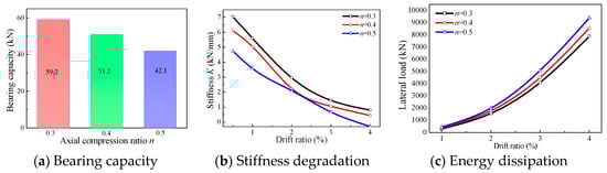 The axial compression ratio is one of the major factors to influence the seismic performance of UHPCFST columns. As shown in Figure 13d and Figure 17, the bearing capacity and lateral stiffness of the UHPCFST columns are both decreased with the increment of the axial compression ratio. Specimen S9, with a higher axial compression ratio of 0.5, experiences great lateral stiffness degradation, with the drift ratio ranging from 1 to 3%, and it even shows negative stiffness when the drift ratio reaches 4%, which is closely related to the second-order effect of the vertical load at the top of the columns. As the axial compression ratio increases, the cumulative dissipated energy is slightly increased. It should be noted that when the axial compression ratio reaches 0.5, neglecting the local buckling causes an overestimation of the maximum value rather than the post-peak ductility, the descending branch of the skeleton curve with the local buckling ignored agrees well with the hysteretic curve. This is mainly attributed to a more severe second-order effect of axial compressive load–lateral displacement under the high axial compression ratio.