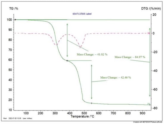 The BLWA were subjected to thermogravimetric analysis (TGA) to determine their thermal stability indicating their type of plastic as shown in Figure 2. The results illustrated that the thermal degradation of BLWA started at a temperature of approximately 250 °C with two-stage decomposition. The first degradation stage of BLWA occurred at a temperature of 190–350 °C due to the decomposition of chlorine in the form of a hydrochloric compound []. Then, at a temperature in the range of 420–550 °C, the second degradation in which the PVC backbone is broken into carbon dioxide and water occurred []. After both stages of thermal degradation, the total weight loss of the BLWA was approximately 85%, and the remaining weight was 15%. This was attributed to the inorganic additive added to PVC during the manufacturing process []. This result agreed with the work of Yu et al. [], suggesting that the thermal degradation of PVC was lower than polyethylene (PE), polypropylene (PP), PET, and polystyrene (PS). In addition, other types of plastic showed one-stage decomposition, while PVC exhibited two-stage decomposition. A similar TGA curve of PVC was also reported by Merlo et al. [] and Suresh et al. []. Therefore, BLWA used in this study were PVC type.