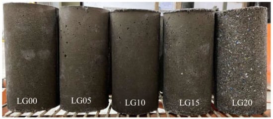 To prepare geopolymer mortar, fly ash was mixed with 10 M NaOH solution for 5 min. Fine aggregate was then added and mixed for 5 min. Then, Na2SiO3 solution was added and mixed further for 5 min. The geopolymer mortar mixture was cast into an acrylic mold and then covered by clingfilm to prevent moisture loss. The specimens were cured in an electric oven at 60 °C for 48 h. Afterward, the specimens were demolded and cured in a humidity chamber with 50% relative humidity (RH) at a temperature of 22 °C until the testing age of 7 days. Geopolymer mortar specimens prepared with different mix proportions are shown in Figure 3, which showed a significant surface change from the sample without plastic used (LG00) on the left to the sample with the highest amount of plastic waste (LG20) on the right. The pictures showed that LG15 and LG20 specimens showed relatively more porous surfaces than those of the other specimens. It was also observed that the BLWA were evenly distributed throughout the LG20 specimen without segregation.