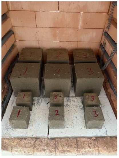 Fire resistivity tests were performed on a control geopolymer mortar (LG00) and LG10 mortar with temperatures of 25 °C (room temperature), 300, 600, and 900 °C. The specimens were placed and arranged in an electric furnace as shown in Figure 4. The heating process was run as described in the previous works [,]. Briefly, the heating rate was increased by 5 °C/min until reached the target temperature and then maintained temperature for 60 min. The specimens were then allowed to cool down to room temperature in an electric furnace before being tested for the following properties: compressive strength, residual strength, weight loss, density, porosity, water absorption, UPV, and thermal conductivity. All tests were carried out in triplicate.