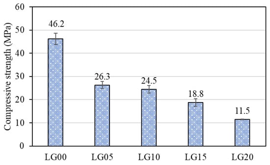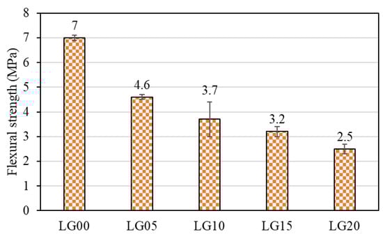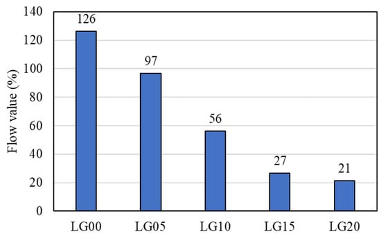 The flow values of geopolymer mortar containing BLWA are shown in Figure 5. The flow value of the control specimen (LG00) was 126%, while that of the geopolymer mortar containing BLWA decreased with increasing BLWA replacement ratio. The impaired fluidity of the fresh geopolymer mortar was due to the flaky and angular shape of BLWA in comparison to the river sand [,]. This finding is consistent with Ferreira et al. [], which showed that spherical PET waste had a less negative effect on workability than flaky and angular-shaped PET. As can be seen in Figure 5, the LG15 and LG20 specimens, which had considerably low flow values, showed more porous surfaces and possibly a decline in the mechanical strengths of geopolymer mortar.