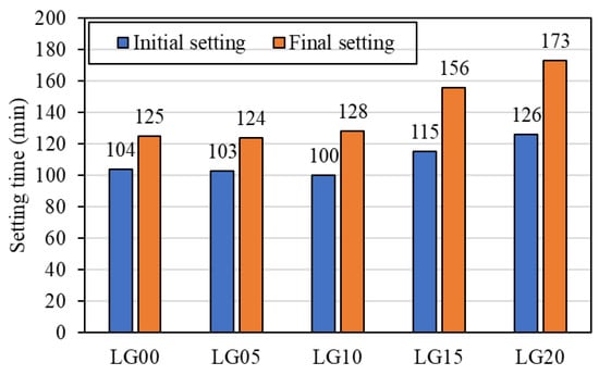 The setting time of geopolymer mortars is shown in Figure 6. The initial setting time and final setting time of LG00, LG05, and LG10 were not significantly different. However, the setting time seems to be longer in LG15 and LG20, with the initial setting time and final setting time of 115 min and 156 min for LG15, and 126 min and 173 min for LG20. The presence of BLWA in the mixture did not hinder the geopolymerization in any way. The longer setting time is due to the more porous structure with less geopolymer paste of LG15 and LG20.