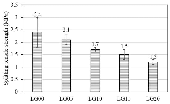 The compressive, flexural, and splitting tensile strengths of geopolymer mortar are shown in Figure 7, Figure 8 and Figure 9. Specimens after failure are also shown in Figure 10. The strengths of geopolymer mortar decreased with the increase in the substitution ratio of BLWA in the mixture. The compressive strengths of LG05, LG10, LG15, and LG20 were 26.3, 24.5, 18.8, and 11.5 MPa, respectively. For the highest substitution level, the compressive strength of geopolymer mortar containing BLWA was reduced by 59% compared to the control sample. This result was consistent with other previous research, which also suggested that a reduction in compressive strength was a result of low bond strength between plastic and the geopolymer paste [,,,,,]. Moreover, the hydrophobic nature of BLWA caused the free water to locate around them, which then reduced the adhesiveness between BLWA and the paste [,]. The significant difference in elastic modulus between plastic aggregate and geopolymer paste also resulted in an imbalanced modulus and thus led to the development of micro-crack causing a decrease in the compressive strength of the composite []. However, the obtained compressive strength of geopolymer mortar containing BLWA (up to 15% replacement) in this present study was higher than the required strength for structural lightweight concrete (17 MPa) as recommended by ACI 213R-14 [].