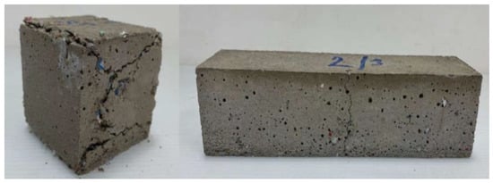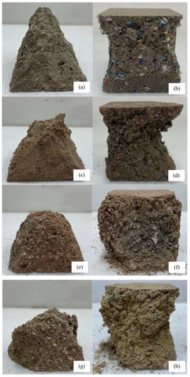 Furthermore, it has been known that geopolymer has a superior fire resistance property than ordinary Portland cement (OPC) because it contains less amount of calcium compounds than OPC []. Temperatures of 200 °C up to as high as 1000 °C could even enhance the compressive strength of the geopolymer due to additional geopolymerization and sintering effect [,]. Nevertheless, the compressive strength declined after exposure to higher temperatures because of the differences in the thermal expansion coefficients of the aggregates and the geopolymer matrix []. In the case of plastic-containing geopolymers, it was found that the studies on the residual strength after exposure to high temperatures were still limited. Therefore, it is interesting to investigate the durability of plastic-incorporating geopolymer in terms of its resistance to fire, which is the focus of this current study.