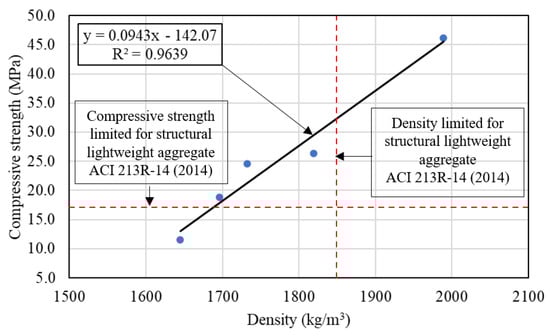 Relationship between density and compressive strength of geopolymer mortar containing BLWA compared with the limited for structural lightweight aggregate as ACI 213R-14 [].