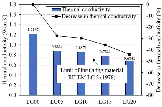 The thermal conductivity of geopolymer mortar is shown in Figure 12. The results indicated that the use of BLWA could improve the thermal-resistant properties of geopolymer mortar. The substitution by 5% of BLWA could cause a dramatic drop of approximately 28% in thermal conductivity when compared to the control geopolymer mortar (LG00). For the highest replacement ratio (LG20), the thermal conductivity of geopolymer mortar was 0.6841 W/m·K, which was 45% lower than that of LG00. This can be explained by the lower thermal conductivity of BLWA than that of the natural sand. Belmokaddem et al. [] experimented with PVC, HDPE, and PP as an aggregate in concrete and found that the higher the replacement content of plastic, the lower the thermal conductivity of the concrete. In addition, Senhadji et al. [] reported a 17% reduction in the thermal conductivity of cement mortar containing 10% PVC waste from pipes compared with reference mortar. It should be noted that the drop in thermal conductivity of mortar containing 10% BLWA compared to LG00 was 30%, which was higher than their finding. Another reason for lower thermal conductivity is that BLWA-containing geopolymer mortar had greater porosity than the control one, in which the pore or air void has the lowest thermal conductivity compared to other geopolymer mortar components []. Reduced thermal conductivity is an advantageous property of lightweight materials because it favors the application of thermal insulation panels in buildings, which can help save energy consumption. According to RILEM LC 2 [], an insulating material can be classified by the thermal conductivity of lower than 0.75 W/m·K. With LG20 having a thermal conductivity of 0.6841 W/m·K in this work, it therefore meets the standard and could be used as thermal-insulating material.