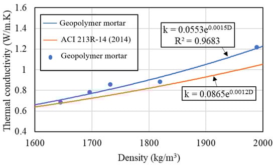 The exponential relationship between density and thermal conductivity obtained in this study is consistent with the relationship computed by the ACI 213R-14 [] recommendation, which is expressed as follows: