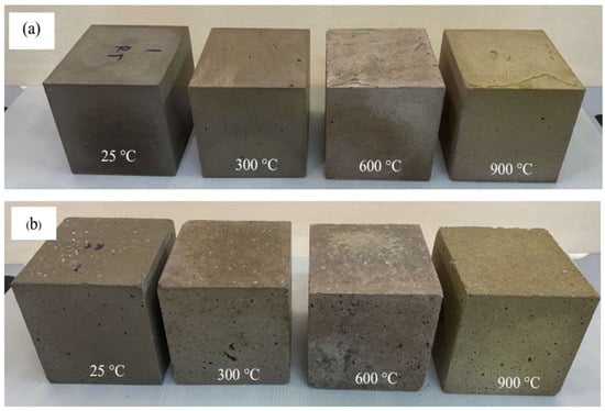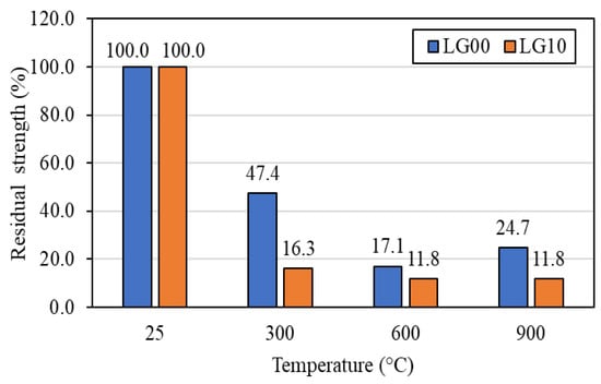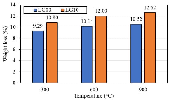 Figure 15 shows LG00 and LG10 after exposure to different temperatures. At room temperature, the LG00 color was a dark gray which is typical of geopolymers. Due to the moisture loss, the color of LG00 was lightened after exposure to a higher temperature of 300 °C. The color of LG00 became reddish brown and light brown after exposure to temperatures of 600 and 900 °C. This phenomenon was also reported by Sarker et al. [], Wongsa et al. [], and Zhao and Sanjayan [], which suggested that the color change was due to the high iron oxide content of fly ash. The discoloration of the LG10 after exposure to higher temperatures was similar to that of the LG00. However, there were black soot deposits on the surface of LG10 after exposure to temperatures of 300 and 600. This is possibly due to the incomplete combustion of BLWA. Although larger pores were observable on the surface of LG10 after exposure to elevated temperatures, which was caused by the gas pressure from the thermal degradation of the BLWA, thermally large cracks were not visible through the surface of the specimens. This ensures the durability of LG10 even after exposure to high temperatures.