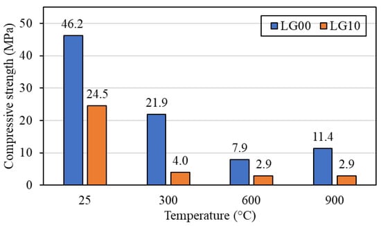 - The compressive strength of 0% BLWA (LG00) and 10% BLWA (LG10) reduced with increasing exposure temperatures (300, 600, and 900 °C). The largest reduction in strength was observed at the temperature of 600 °C, considered a critical exposure temperature for this material.