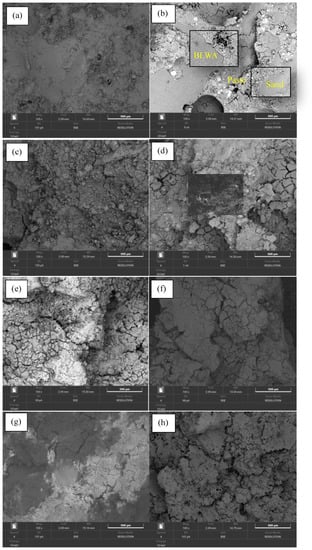 Figure 16 illustrates the cracked surfaces of LG00 and LG10 after being tested for compressive strength. It was found that the matrix of LG00 varied markedly after exposure to elevated temperatures, wherein the denseness and homogeneity of the matrix were reduced. Meanwhile, apart from the alteration of the colors of the matrix and the external surface, the color of the sand also changed (Figure 16a,c,e,g). In the case of LG10, it was noticeable that BLWA dispersed throughout the specimen without segregation (Figure 16b). After exposure to the temperature of 300 °C, the BLWA thermally decomposed, and several dark brown spots on the cracked surface from the incomplete combustion of BLWA were observed (Figure 16d). The dark brown color became lighter after exposure to 600 °C (Figure 16f). At 900 °C, the highest calcined temperature in this study, the brown/black stains and the BLWA were not visible in the specimen (Figure 16h).