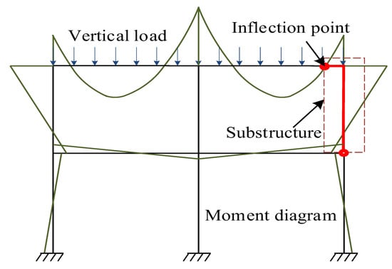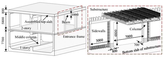 An actual engineering case under construction in China was selected as the prototype structure for this study. The subway station comprises a two-story, three-span structure, as shown in Figure 2. The total height of the story where the entrance system is located is 6600 mm, of which 800 mm is the thickness of the laminated top slab, and 5800 mm is the height of the precast sidewalls. The entrance opening dimensions are 4800 (height) × 7000 (width) mm, and the thickness of the laminated sidewalls is 700 mm, wherein the cast-in-place and precast layers are 350 mm. The height of the entrance frame is 5800 mm, and the distance between the column centers is 7800 mm. The cross-sectional dimensions of the columns are 800 × 700 mm, and the height and width of the beam are 1000 and 700 mm, respectively. Furthermore, the thickness of the entrance frame is identical to that of the adjacent sidewalls. One entrance substructure (Figure 2) is taken out from the top floor of the prototype building. The total height of the substructure was uniquely determined by the height of the story wherein the entrance system was located. The overhang length of the assembled top slab was determined based on the bending moment diagram of the top story of a subway station under uniform vertical loads (Figure 3). A single standardized precast sidewall panel was retained on both sides of the entrance frame, and the width of each sidewall panel was 3000 mm. In addition, the boundary conditions of the substructure are completely consistent with the actual station structure.