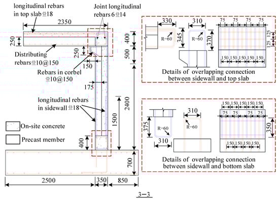 The cross-sectional dimensions of the scaled-down single standard sidewall were 1500 mm × 350 mm, and the sectional dimensions of the scaled-down top slap were 7300 mm × 400 mm. The total height of the sidewall was 3300 mm, and the horizontal distance between the cantilevered and the fixed ends of the top slab was 2350 mm. As illustrated in Figure 4, grade HRB400 deformed 18 mm-diameter rebars with 150 mm spacing in the longitudinal direction were uniformly placed in the sidewall and the top slab to function as longitudinal reinforcement. The longitudinal reinforcement ratios of the sidewalls and top slab resulting from this configuration were 1.07% and 1.28%, respectively. Furthermore, the outer-side reinforcement of the sidewalls (i.e., tensile reinforcement) was arranged double-layered within a vertical range of 1500 mm from the bottom slab. This design can be attributed to the flexural moment at the bottom end of the sidewalls being significantly less than that at the top end under actual vertical loads (Figure 3). This could be utilized to guarantee that the expected flexural failure is controlled in the top region instead of the bottom end of the sidewall. Grade C50 concrete was used as the precast concrete of the entrance frame, sidewalls, and slabs. Grade C40 concrete was used for the cast-in situ concrete of the beam–column connection region, sidewalls, and top slab. In addition, the contacting surfaces of both the semi-precast top slab and sidewalls were roughened based on the recommendations in the concrete design specification [] to transfer shearing force.