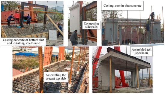 The construction process of the test specimens is illustrated in Figure 5. A partial precast top slab and sidewalls were prefabricated in a factory. For convenience, the bottom slab was manufactured directly at the designated test position. The H-steels of the entrance frame were installed in their designed positions before the concrete of the base plate was poured. The semi-sidewalls were then connected to a steel frame when the bottom slab was cured. Subsequently, the precast concrete encasing the steel frame and the on-site concrete of the sidewalls were poured in batches. Finally, the precast top slab was connected to the assembled frame and sidewalls. The precast part of the concrete in the specimen was cured under indoor conditions, and the cast-in-place part of the concrete was cured under outdoor conditions. During the curing process, attention was paid to the maintenance of the concrete surface temperature, and no obvious cracking of the concrete surface occurred.