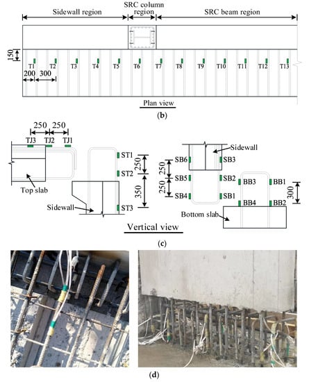 Figure 7 presents the arrangement of the strain gauges for each member of the specimen. To measure the tensile strain distribution along the longitudinal direction of the sidewall, 10 general-purpose strain gauges (i.e., S1 to S10) were arranged longitudinally on the tensile reinforcement along cross-section 4 at a vertical distance of 800 mm from the beam bottom, as shown in Figure 7a. Simultaneously, 13 strain gauges (i.e., T1 to T13) were attached to the upper-layer reinforcement at the top slab end section to monitor the longitudinal strain distribution between the entrance opening and sidewalls, as shown in Figure 7b. To measure the stress state of the SRC column, strain gauges CR1 and CR2 were arranged on the compressive and tensile reinforcements of the column, respectively, and strain gauges F1 to F4 were placed on the column flange at cross-section 4.