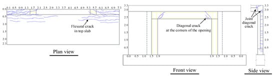 When the horizontal cracks in the sidewalls spread over the entire column section, flexural cracks were also observed in the top slab at an applied load of 308 kN (approximately 0.35Py). As shown in the plan view in Figure 9, the propagation of flexural cracks was concentrated at the fixed end of the slab within the range of the sidewalls, and only a limited number of cracks grew in the opening region throughout the test. Upon further increasing the applied load to 396 kN (approximately 0.45Py), a few diagonal cracks initially appeared at the joint between the sidewalls and top slab, as shown in the side view in Figure 9. Interestingly, the joint diagonal cracks did not propagate to the core region throughout the loading process, and the maximum crack width was 0.3 mm. In addition, no splitting cracks occurred at the location of the U-type rebar, implying that no bond slippage occurred between the U-type rebar and concrete throughout the test.