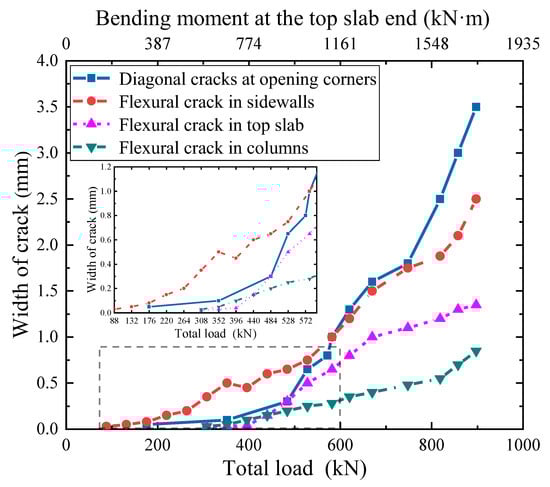 Figure 10 shows a comparison of the crack width development at the opening corners, SRC columns, top slab end, and sidewalls of the specimen. As mentioned in [,], the presence of cut-outs in traditional concrete walls encourages cracks to appear first at the corners of the opening. However, owing to the entrance frame setting in the specimen, cracks in the sidewalls appeared before those at the corners of the opening. At the initial loading stage, the width of the flexural crack in the sidewall was the largest compared to other members. When the total applied load was increased to 582 kN, the crack width at the corners of the opening gradually exceeded that of the sidewalls. The extremely rigorous crack width control requirement in underground structures is meant for the expectation of providing excellent resistance to the penetration of water and chemicals. Notably, the development of the crack width at the corners of the opening was more abrupt than that in other members. Therefore, more attention must be paid to the reason for the formation and width control of cracks at the opening corners. For the top slab and sidewalls, only the maximum crack widths during each monotonic loading process are shown in Figure 10. In actuality, the width of the horizontal flexural cracks in both the sidewall and top slab gradually increased from the opening to the outside edges, thereby directly demonstrating the lag effect of the entrance frame on the stress development of longitudinal rebars in adjacent members.