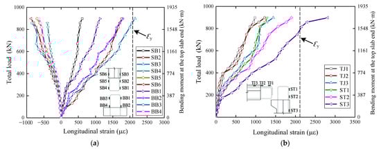Figure 11a illustrates the relationships between the applied load and the strains of the U-type reinforcement in the connection between the sidewalls and the bottom slab. Gauges SB6 and SB3 were attached to the longitudinal reinforcement outside the overlapping region of the U-type rebar. Their arrangement was utilized to directly realize the development of the longitudinal strain in the sidewall. Furthermore, at each load level, the longitudinal strain value of the U-type reinforcement decreased gradually from the sidewall to the core region of the joint. This was attributed primarily to the presence of bond stress between the overlapping rebars and surrounding concrete. In such cases, the longitudinal strain of the overlapping U-type rebar maintained elasticity throughout the test.