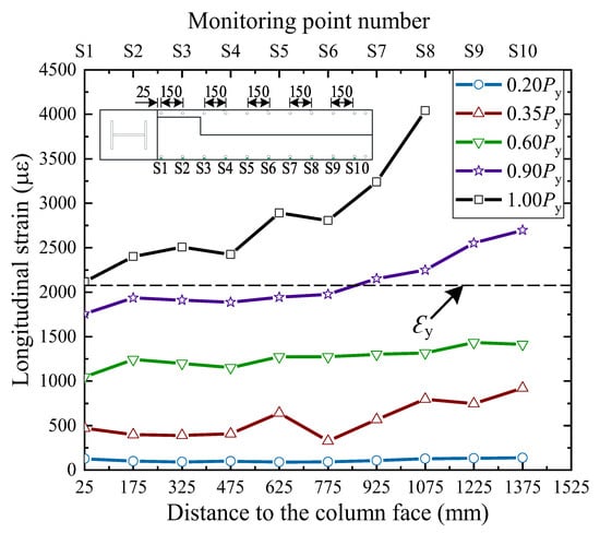 The longitudinal reinforcement strain distribution along the sidewall cross-section is shown in Figure 12, which can be used to further analyze the effects of the entrance frame on the stress distribution within the sidewall. As observed, the longitudinal reinforcement in the edge of the sidewall, further from the entrance frame, attained yield strength first during the testing process. Subsequently, the tensile reinforcement in the sidewall region close to the frame began to gradually yield. It could be seen that the presence of the entrance frame had a lag effect on the stress development of the longitudinal reinforcement in its adjacent local regions. This further demonstrated that the developed entrance frame could effectively prevent stress concentration on both sides of the opening and could facilitate crack width control in the sidewalls.