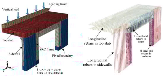 The boundaries and loading conditions of the model were applied based on the test results. Because of the constant restraint of the bottom slab to the sidewalls and entrance frame and the effectiveness of the bottom joints of the sidewall throughout the test, fixed boundary conditions were uniformly formulated to simulate the constraints of the bottom slab on the sidewalls and frame. Here, the degrees of freedom in the X-, Y-, and Z-directions at the bottom ends of the sidewalls and frame were restricted, respectively. To reproduce a uniformly distributed load at the top slab end, a loading beam model with a flexural stiffness similar to that of the experimental steel beam was developed. The modeled beam was tied at the end of the top slab using the constraint feature in ABAQUS []. A vertical load was directly applied at the top of the modeled beam and controlled by the loading protocol used in the test.