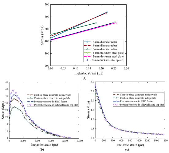 The rebar and H-steel in the model were treated as the elastic–plastic materials, and the material characteristics in compression and tension were similar. The multiple linear kinematic hardening model [] can be used to describe the mechanical behavior of steel. The parameters of the steel model were determined based on the material test results, as summarized in Table 2. The stress–strain curves of the steel are depicted in Figure 17a. The axial compressive and tensile plasticity damage model [] can be used to analyze the mechanical performance of concrete. The critical parameters of the model were obtained from the material test results, as listed in Table 1. The compressive and tensile stress–strain curves of the concrete were drawn based on the method proposed in GB 50010 [], as shown in Figure 17b,c. In the concrete damage plasticity (CDP) model, the dilation angle is 30°, the eccentricity is 0.1, the viscosity parameter is 0.005, and the ratio between the concrete strength in terms of biaxial and uniaxial strength is 1.16. The concrete damage factors of different components in the CDP model can be determined according to the recommendations provided in the ABAQUS standard user’s manual [], as shown in Equations (2) and (3).