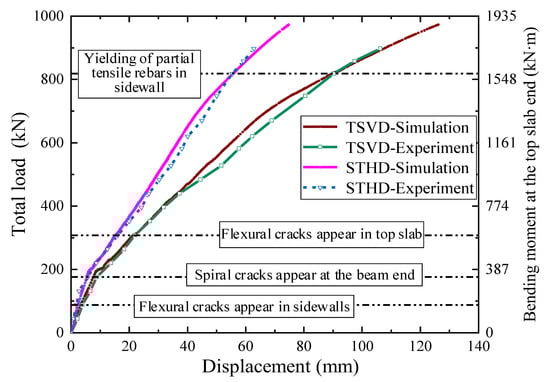 The total applied load measured by the compression load cell versus the horizontal and vertical displacements measured by the LVDTs is shown in Figure 8. Here, the vertical displacement at the loading end of the top slab (TSVD) was measured using LVDTs V1–V3. It can be seen that the incremental difference in the TSVD along the longitudinal direction of the station was negligible. Furthermore, the out-of-plane horizontal displacements at the top of the sidewall (STHD) and the top of the entrance frame (ETHD) were monitored using LVDTs H1 and H6, respectively, and the measurements indicated an insignificant difference between the two displacement increments. As the formal loading was terminated when all tensile rebars of the sidewalls entered the yield stage, the applied load increased almost linearly, with extremely limited inelastic deformations. The total applied loads and displacements corresponding to each stage of the test specimen during the loading process are shown in Figure 8.