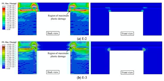 The maximum principal inelastic strain patterns of the concrete materials from the FE analysis could be used to simulate the distribution of cracks in the specimen. Figure 19 displays the principal inelastic strain distributions of the concrete materials under the Py load. As shown in Figure 19, the most critical plastic damage occurred at the SRC beam ends and the adjacent top slab and SRC columns, coinciding with the diagonal crack-concentration regions of the specimens during the test. The principal strain on the sidewalls gradually decreased from the outside edge to the entrance frame. This trend was in favorable agreement with the development of the longitudinal reinforcement strain and concrete crack width along the sidewall cross-section. The comparison confirmed that the developed FE model could accurately show the development of cracks around the opening.