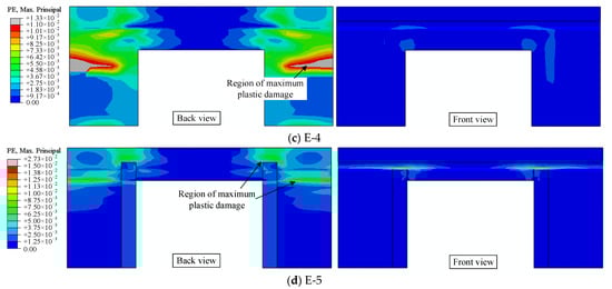 Figure 20 further shows the maximum principal inelastic strain distributions of the concrete materials under the Py load for Cases E-2 to E-5. Similar to E-1 (Figure 19), the maximum plastic damage of concrete materials in E-2 was also concentrated at the SRC beam ends, and the damage region gradually expanded to the top slab and sidewalls. Note that the plastic damage area of E-2 was significantly greater than that of E-1, which can be explained by the lower torsional capacity of the normal concrete beam than that of the SRC beam. In contrast to E-1 and E-2, the location of the initial plastic damage at the beam ends of E-3 was almost aligned to the central section of the SRC column. This phenomenon can be attributed to the absence of H-steel in the column, which significantly reduced the resistance of the column to the torsional moment transmitted from the beam end. It is therefore deduced that the variations in the flexural resistance of the column had a significant effect on the development of the cracks at the open corners.
