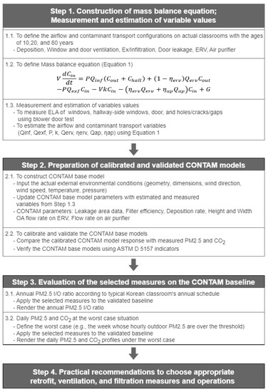 Step 1: Actual elementary and middle school classrooms with the ages of 10, 20, and 80 years were selected, surveyed, and measured to obtain the airflow and contaminant transport configurations as depicted in Figure 2. Then, variables representing the configurations were quantified using the mass transport equation (Equation (1)) (Section 3.1).