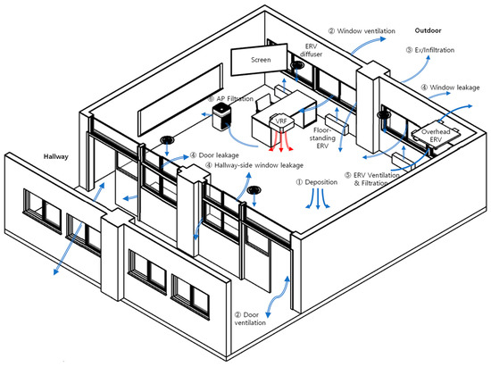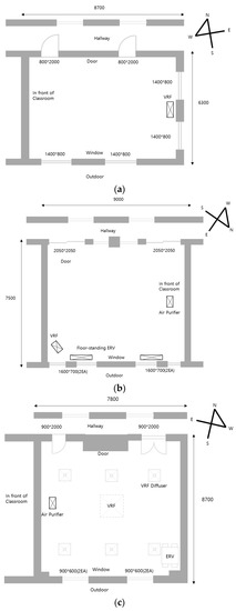 Most Korean elementary, middle, and high school classrooms do not have central air-conditioning systems (i.e., no air-handler), while existing old schools used to rely on steam radiators for heating only. Like many schools described in the literature, they used to rely on natural ventilation for cooling and fresh air. However, in the 2000s, they began to install separate stand-alone ACs in the classroom. Currently, most retrofitted schools are equipped with variable refrigerant flow (VRF) systems that can service heating and cooling at the same time. Because VRF systems do not provide the required ventilation rate as central air handlers do, a separate mechanical ventilation system must be installed by law [30]. In most domestic retrofit projects, an energy recovery ventilation (ERV) system is installed instead of a heat recovery ventilation (HRV) system due to the large outdoor humidity variation across seasons. According to related laws and regulations [35], supply air (SA) filters with minimum efficiency reporting value (MERV) ratings of 12 or higher must be installed in ERVs. If it is difficult to install ERVs, an AP can be an alternative. In this case, an AP with filtration capability that covers at least 150% of the standard classroom area (66 m2) should be set up [35]. HEPA filters are typically equipped with APs.