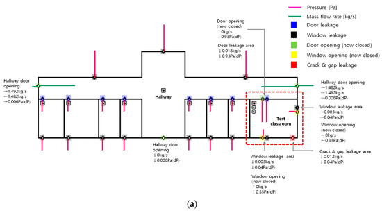Although economy products are typically installed for windows and doors in the hallway-side walls of classrooms (B2a, B3a), replacement options using first-grade airtight products were also considered (B2b, B3b). This study assumed that the airtightness of economy rail doors corresponds to the airtight 30th-grade according to a previous experimental study [37], and the airtightness of economy PVC windows corresponds to the airtight sixth-grade according to a previous experimental study [38].