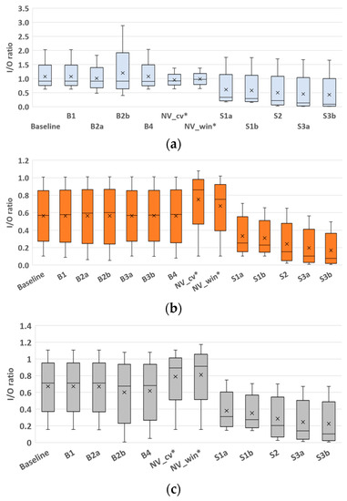 (i) Even if the building retrofit measures to enhance the airtightness of enclosures (B1–B4: window and door replacement and added insulation) were applied, in all three cases, there was no significant change in the annual PM2.5 I/O ratio during class compared to the baseline. This is because ambient PM2.5 in the hallways entered the classroom every break time (e.g., 10 min recess for every 1 h class) and 1 h of lunchtime when the door was left open; it made the classroom PM2.5 concentration during class almost as high as the hallway concentration, regardless of the decreased infiltration and penetration through the retrofitted envelope.