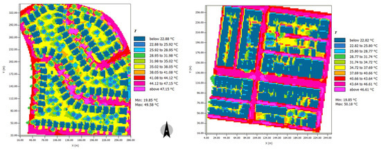 Figure 7 depicts the mean radiant temperature (MRT) simulated at a height of 1.5 m above the ground level at noon for the two blocks. MRT is considered the most important meteorological factor for evaluating outdoor thermal sensation under sunny conditions, regardless of the comfort index used [54]. The MRT range for both models is almost identical, with values exceeding 60 °C for streets that are fully exposed to solar radiation and constructed with asphalt. However, the effects of shading and evapotranspiration from trees result in a range of MRTs between 47 °C and 51 °C for areas below or close to trees (yellow to green areas), leading to an average MRT of 54.5 °C at street level in Block 1, while a very low number of trees in Block 2 led to an average simulated MRT of 61.5 °C. It should be noted that the average values are calculated for the entire street surfaces, including areas under trees and other surfaces made of asphalt and concrete pavement. The influence of grass coverage on MRTs was negligible, with grassy areas exhibiting MRTs that were at most 2 °C lower than other surfaces in the two blocks. Additionally, the simulations revealed a minimum MRT of 35.41 °C and 38.47 °C and a maximum of 66.45 °C and 67.12 °C for Block 1 and Block 2, respectively.