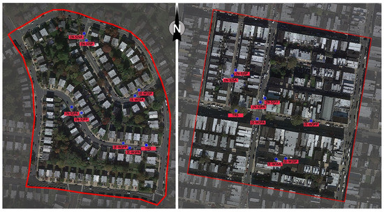 In order to construct three-dimensional models of neighborhoods, Grasshopper 3-D and Meerkat, which are based on Rhinoceros software, were utilized. The process of using these tools to create urban 3-D models is explained in detail in [49,50]. The resulting raw 3-D geometries were then imported into Dragonfly, a plug-in created [51] for use in Grasshopper, which enables the creation of 3-D models using Envi-met (INX). To incorporate specific urban characteristics, such as construction materials, land cover, albedo, and anthropogenic heat generated by human activities, the two areas under investigation were classified based on the local climate zone (LCZ) system. The LCZs categorize landscapes based on a typical range of values for surface cover, urban structure, fabrics (radiative and thermal properties of construction materials), and anthropogenic heat flux [52]. The LCZ classification scheme consists of 10 built and 7 land cover types, and each of the 17 basic types is associated with typical value ranges for a set of key urban parameters. The definition and physical properties of all LCZs are provided in 17 illustrative datasheets. Accordingly, the tract with STFID of 42101021700 (top images in Figure 4, simply Block 1, hereafter) was classified as LCZ6: Open low-rise, where buildings are detached and small size with 1–3 stories tall. On the other hand, the tract with the STFID of 42101004101 (bottom images in Figure 4, simply Block 2, hereafter) was classified as LCZ 3: Compact low-rise in which buildings are attached or closely spaced with 1–3 stories tall. Land cover in LCZ 3 is mostly paved or hard-packed; LCZ6 is mostly covered by scattered trees and abundant plants (Figure 6). In order to balance the need for accurate simulation results with the computational time required, the 3-D models were constructed for only a portion of the selected tracts. Specifically, the models were created to cover an area with a minimum diameter of 400 m (or a radius of 200 m), which is the minimum size specified in the LCZ description.