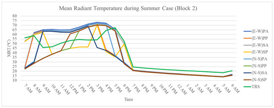 By selecting points in different locations, the study was able to gather data on the varying effects of different surface types and orientations, which allowed for a more nuanced analysis of the simulated climate variables and their impact on human comfort. Figure 11 and Figure 12 illustrate hourly MRTs simulated at each point inside Block 1 and 2 during the summer case, respectively. The simulation was programmed to take measurements every hour, starting at 6:00 am and ending at 6:00 am, 24 h overall.