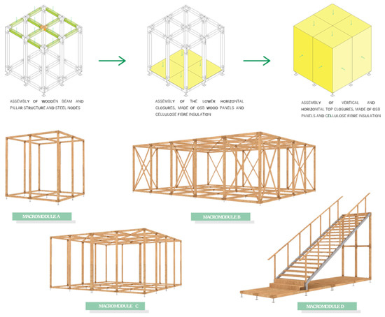 - To design one or more macro-modules resulting from the combination of basic modules that allow for dimensionally and functionally different spaces congruent with the requirements determined in the previous phase and the pre-existence.