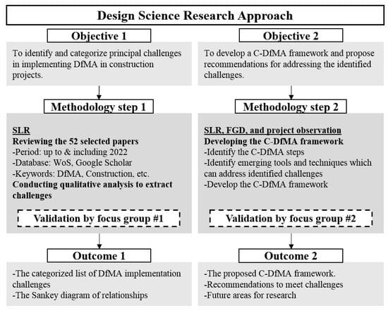 To develop knowledge and contribute to the body of theory and practice in this field, this study adopted an exploratory research approach for examining the current challenges of applying DfMA in construction and investigating and proposing alternate courses of action. To achieve this goal, we followed a design science research (DSR) approach, which is a multi-step research method, consisting of systematic literature reviews, focus group discussions, and case studies []. Deriving from the community of practice, DSR is an analytical and creative approach that develops exploratory and instrumental research techniques to achieve practical desired outcomes []. In this technique, a constructivist, action-oriented, and interpretive qualitative research strategy is applied in the construction of an artefact such as a framework or an algorithm []. The DSR method involves people exploring, inducing, developing, and testing models around user-centered values, interests, challenges, and concerns []. To validate the outcomes, we adopted a focus group discussion (FGD) method over semi-structured interviews. The FGD method is an exploratory practice in which a group of experts collectively interact and share opinions in a dynamic and interactive group discussion []. According to [], each focus group consists of 5 to 25 experienced experts in the area of study. This method has been widely adopted for qualitative research [] and is recommended to be used for studies in which interactions, exchanges of ideas, and multiple perspectives of diverse stakeholders about a topic are required [].
