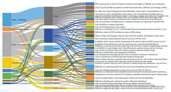The Sankey diagram shown in Figure 2 illustrates the relationship between the DfMA implementation challenges in construction projects, drawn from the 52 selected articles. The width of the arrows is proportional to the flow rate. This Sankey diagram of relationships can be used to understand which stakeholders contribute more significantly to the identified challenges, and at which stages of the construction projects these challenges occur most frequently. This can help researchers and practitioners investigate the root causes of barriers to the implementation of DfMA strategies in construction projects more quickly and direct them toward applying appropriate remedial actions to address these hindrance factors according to their associated stakeholders and project phases more efficiently.