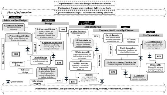 To efficiently apply construction-oriented DfMA strategies in construction projects, BIM, lean, and I4.0 operational systems and processes are required. BIM-based platforms can streamline the flow of information between different stakeholders and support integrated design-to-production workflows throughout the project life cycle [,,,]. BIM improves communication and collaboration among project participants by connecting DfMA downstream activities (i.e., supplying, procurement, manufacturing, delivery, assembly, and installation) to upstream activities (i.e., initiation, briefing, appraisals, and conceptual design) []. Lean operational systems focus on the definition of production systems that can deliver the project from initiation/design through to construction []. In fact, some emerging concepts in the construction industry, such as IPD and integrated business models, use lean as a foundation []. Similar to DfMA, lean is also borrowed from the manufacturing industry. Lean-related concepts, tools, principles, processes, and systems such as Last Planner System (LPS), A3s problem solving, Target Value Design (TVD), Choosing By Advantages (CBA), and Pull Planning are all based on adding value and diminishing waste in projects. In the construction-oriented DfMA framework, the lean operational processes are concrete, observable, specific, and act as part of the framework. On the other hand, Industry 4.0 (I4.0) technologies are tools that are required for the implementation of these lean processes. I4.0 technologies enable proximity and integration for construction supply chains [,,]. These technologies improve collaboration between all project participants. Unlike the manufacturing industry, in the construction industry, products (buildings) carry both product-level (i.e., prefabricated modules design dimensions, engineering features, plant production processes, etc.) and project-level (i.e., site planning, as-built elements, on-site activities, etc.) information []. Therefore, an information-sharing platform for implementing the construction-oriented DfMA framework should support both product- and project-level information management. Emerging I4.0 tools and technologies can be useful in deploying the construction-oriented DfMA framework. For instance, cloud-based real-time data sharing platforms can help in monitoring project progress and daily operations regarding health, safety, quality, and environmental impact. Tracking technologies, such as IoT-based applications, can help to control the structural performance of the building elements [,,]. To further enhance the implementation of the construction-oriented DfMA framework in prefabricated projects, the I4.0-based information-sharing platforms could support various degrees of mass customization [,,].