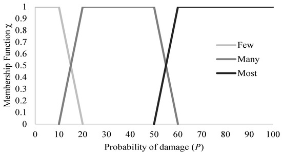 As a further development of the EMS-98, the implicit DPM was converted into numerical quantities by combining fuzzy sets and probability theories in the context of the RISK-UE project [24]. Using the fuzzy set theory, the language expressions “Few”, “Many”, and “Most” were converted into their quantitative equivalents on a scale of 1 to 100 as a percentage of probability of damage (p), using a membership function (Figure 1 and Table 3). A binomial density function of probabilities is introduced for the probability at each damage level:
