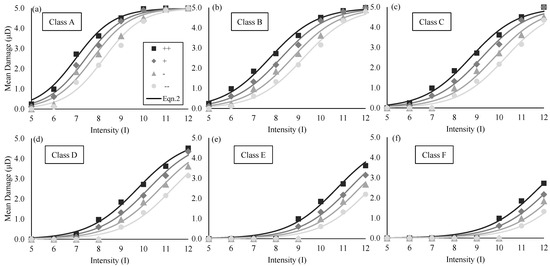 Mean damage vs. earthquake intensity for each vulnerability class and sub-class: (a) class A; (b) class B; (c) class C; (d) class D; (e) class E; (f) class F.