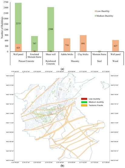 Based on information from the government agency (KazNIISA), approximately 8171 multi-story residential buildings were constructed in the Soviet Union era from the 1960s to the 1990s. These buildings were categorized according to the construction materials, lateral force-resisting systems, and ductility capacities. The construction materials include masonry, reinforced concrete, precast concrete, wood, and steel. The lateral force-resisting system consists of a bearing wall, wall panels, emulated moment frame, moment frame, and shear wall. According to the construction materials, year of build, and design code provision, the building was also categorized with medium and low types of ductility capacities. In general, the buildings designed and constructed before 1980 do not have sufficient seismic design considerations, which are categorized as low ductility [25]. The buildings designed and constructed after 1980 have generally adopted seismic design requirements, categorized as medium ductility [26]. Figure 3a shows the number of residential buildings grouped into several categories, while Figure 3b depicts the location of these residential buildings on the map of Almaty. Furthermore, the photos of each category are provided in Appendix A. The majority of residential buildings were constructed with precast and reinforced concrete. There are also significant amounts of masonry and wood buildings.