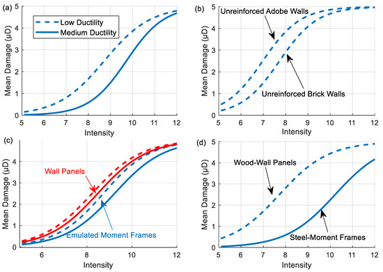 Mean damage vs. intensity for different groups of residential buildings: (a) reinforced concrete shear wall; (b) masonry; (c) precast concrete; and (d) steel and wood.