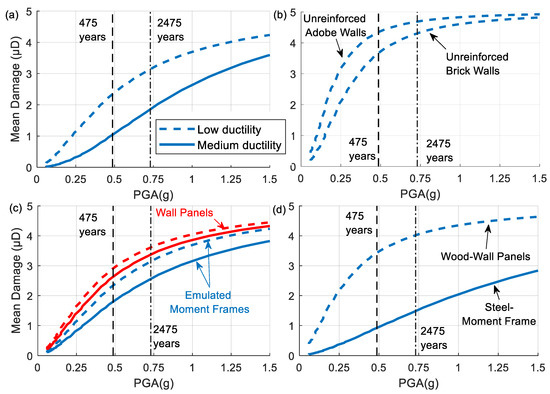 Mean damage vs. PGA for different groups of residential buildings: (a) reinforced concrete shear wall; (b) masonry; (c) precast concrete; and (d) steel and wood.