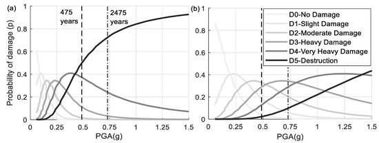 After investigating the mean damage level for the residential buildings, it was also worthwhile to evaluate the probabilities of the damage. The probability of the damage at each damage level can be obtained by inserting the mean damage value for each residential building group into Equation (1). Since the mean damage (µD) is related to the PGA, the relationship between the probability of damage and PGA can be developed for each residential building group. As an example, Figure 7 shows the density probability of damage (p) vs. PGA for two groups of buildings: (a) masonry with brick walls; and (b) reinforced concrete shear walls with low ductility. The PGAs corresponding to the DBE and MCE in the Almaty region are indicated in Figure 7 as vertical dashed and dash–dot trend lines, respectively. As seen in Figure 7, the probability of damage for D5 increases with the increase of the GPAs, while the probability for low damage level (D1 and D2) was high at low GPAs. The masonry buildings with low earthquake-resistant capacity tended to have a high probability of damage at high damage levels. The reinforced concrete buildings with higher seismic capacities had a high probability of damage at moderate damage levels.
