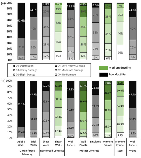 As seen in Figure 5 and Figure 6, the unreinforced masonry and wood buildings are expected to incur a level of D4–D5 (very heavy to destruction) damage under the MCE and a D3–D4 (heavy to very heavy) damage under DBE. The expected damage for reinforced and precast concrete buildings ranged from D2 (moderate) to close to D4 (very heavy), depending on the lateral force-resisting system and ductility capacity. It might be necessary to conduct analytical assessments since structures at these damage levels will behave nonlinearly and have high uncertainties in the seismic demand, as observed in the following studies [29,30]. The steel buildings only expected a D1 (slight)−D2 (moderate) damage at the DBE and MCE.