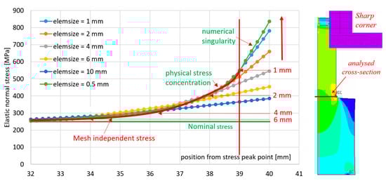 - In the stress concentration zone at first the mesh-independent stresses should be determined by a mesh sensitivity study, eliminating the numerical singularities from the obtained results.