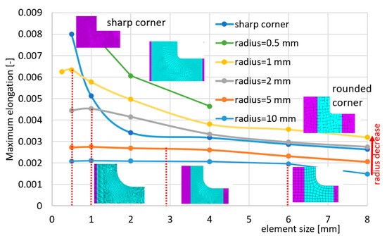 - However, the maximum strains are significantly dependent on the applied mesh size. If rounded corners are applied in the numerical model, the maximum strains are tending to a maximum value, and do not go to the infinite by decreasing the mesh size.
